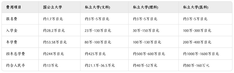 私立大学的学费:文科专业(如文学、经济)第一年费用包括入学金23万-130万日元和学费80万-100万日元,合计103万-230万日元(约5.15万-11.5万元人民币)。第二年起每年缴纳80万-100万日元学费,四年总费用约21.1万-36.5万元人民币。理科专业(如工程、生物)学费更高,每年100万-130万日元(约5万-6.5万元人民币),四年总计约40万-52万元人民币(含入学金)。而医科、齿科等专业更是高达200万-400万日元/年(约10万-20万元人民币),四年学费总计可达80万-160万元人民币。